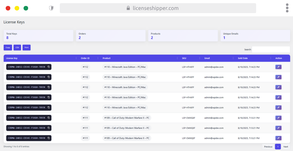 - Use the Search bar to quickly locate keys by product, SKU, or email.